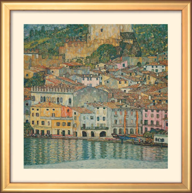 In Set sind die vier Bilder »Kirche in Cassone am Gardasee«, »Malcesine am Gardasee«, »Apfelbaum I« und »Die Sonnenblume«. Die vier Bilder von Gustav Klimt wurden aufwendig auf büttenähnlichem, schweren 250g Gmund Tactile reproduziert und sind in goldfarbener Massivholzrahmung gefasst. Ebenfalls sind alle Werke auch einzeln erhältlich.