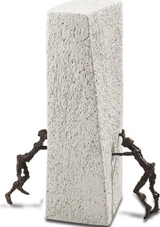 Auch diese Skulptur besticht durch ihre Dynamik und den tiefen Kontrast zwischen dunkel patinierter Bronze und hellem Steinguss-Sockel.