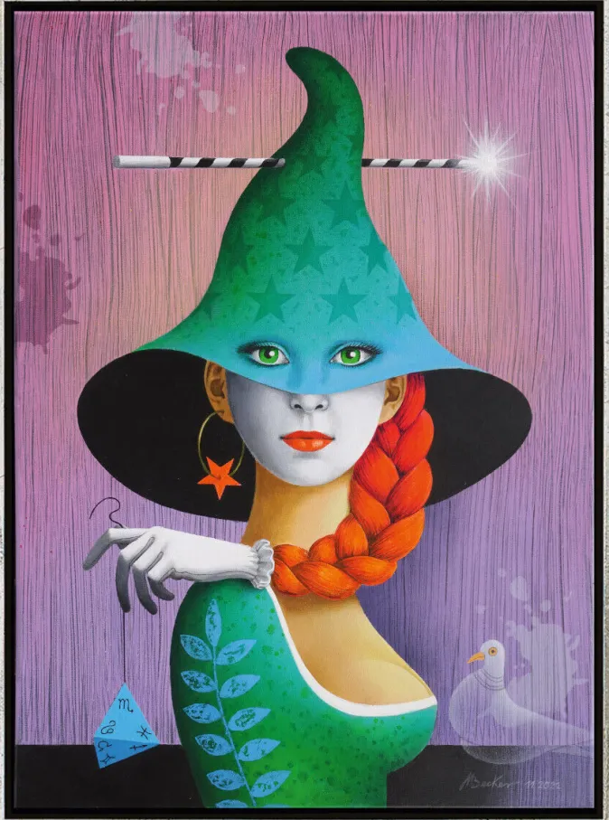 Entdecken Sie das faszinierende Gemälde »Mit Zopf und Zauberhut« von Michael Becker aus dem Jahr 2022, präsentiert in einem eleganten Rahmen! Tauchen Sie ein in die magische Welt des Künstlers, während er mit seinen Pinselstrichen eine einzigartige Geschichte erzählt.