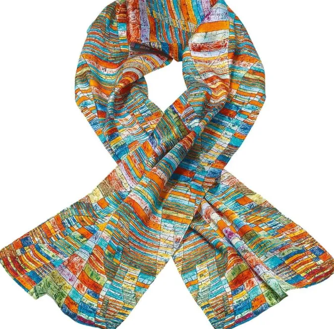 Das berühmte Gemälde Paul Klees mit seinen farblich harmonischen Streifen verleiht diesem handroulierten Schal aus 100 % feinster Satinseide sein einmaliges, grafisches Muster. Ein Muss für Freunde des Ausnahmekünstlers!