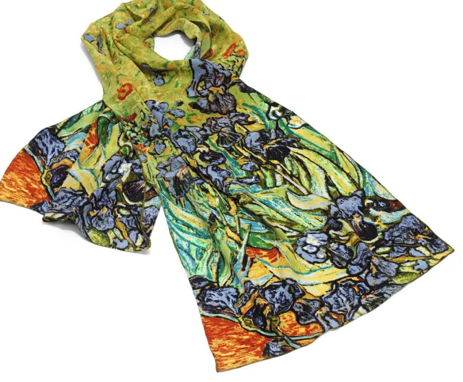 Nicht ohne Grund gehören van Goghs Blumendarstellungen zu den bedeutendsten Werken seiner Zeit. Der außergewöhnliche und farbenfrohe Schal ist dem Werk »Iris« von Vincent van Gogh aus dem Jahr 1889 nachempfunden. In 19 Farben auf 100 % reiner Seide produziert und rouliert. Leichte Format- und Farbabweichungen sind Zeichen der reinen Handarbeit.