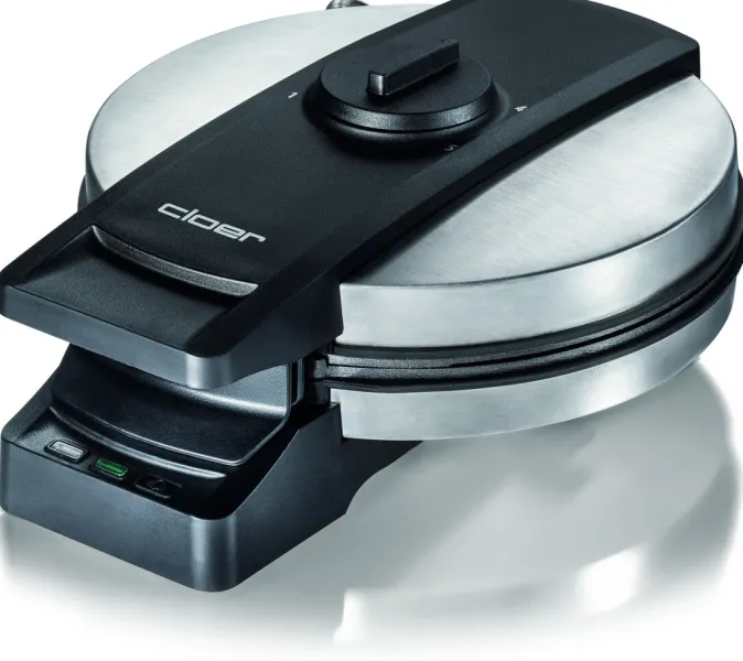 Das Cloer 1898XL bietet optische und akustische Fertigmeldungen, die Ihnen das Backen erleichtern. Durch das innen liegende Scharnier und die praktische Fettauffangrille ist die Reinigung mühelos. Die patentierte Kabelaufwicklung verriegelt das Gerät, sodass es platzsparend auf den Griffen stehend verstaut werden kann.
