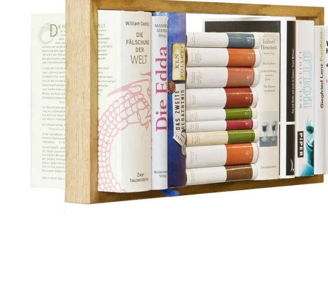 Zeitlos, individuell und in Handarbeit gefertigt. Das Regal »b« lässt Bücher scheinbar schweben und setzt sie somit wirkungsvoll in Szene. Ob Kunstband, ZEIT-Edition oder Taschenbuch – einzig der massive Holzrahmen scheint den Büchern ihren Halt zu geben. Ohne Bücher lüftet sich das Geheimnis: Eingelassene Edelstahlwinkel halten die Konstruktion an der Wand und lassen die Bücher schweben.