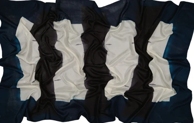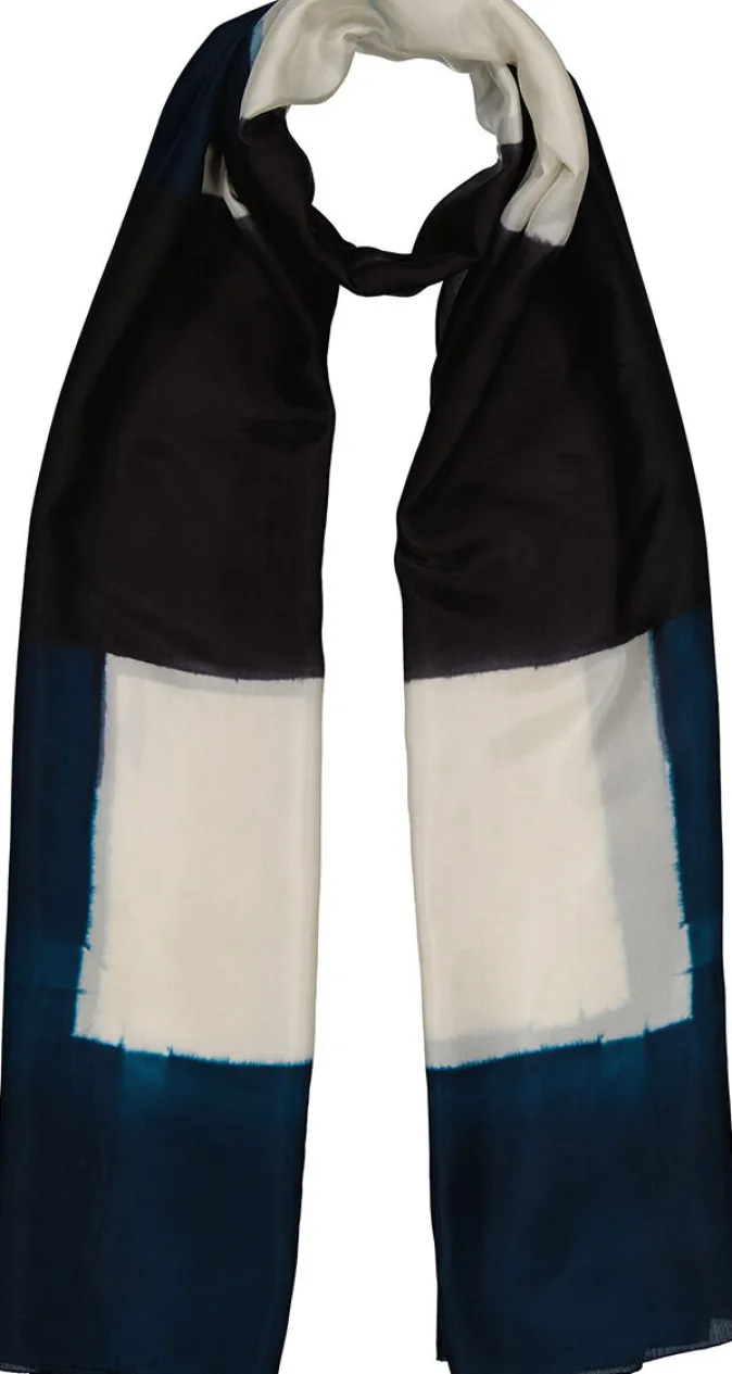 Der »LIGNES« von denovembre, ist ein großer eleganter XL-Schal aus sehr feinem Seidenpongee. Die breiten, horizontalen Linien entstehen durch die Shibori, einem handgefärbten Verfahren in japanischer Abbindetechnik. Mit handrollierten Kanten.