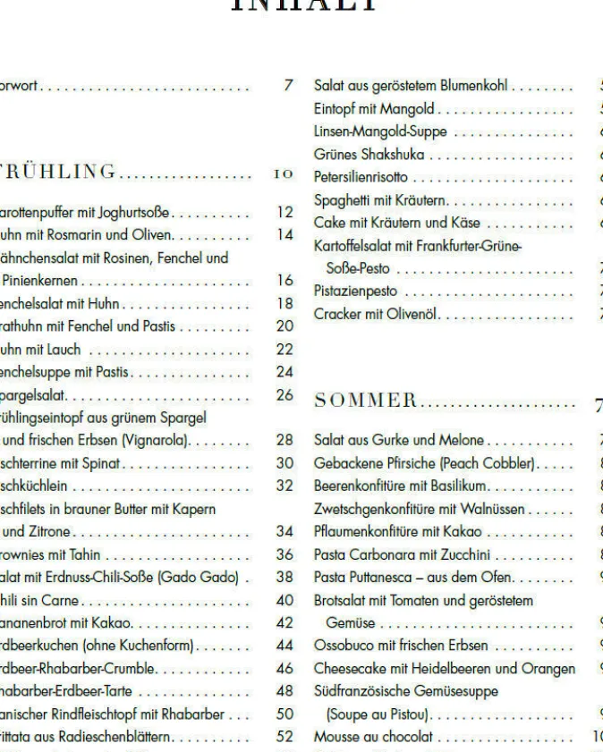 Die Rezepte sind nicht nur ein sprachliches Glanzstück, sondern auch sehr lehrreich: Charmant erklärt die Autorin, warum der deutsche Kümmel dem orientalischen Kreuzkümmel in nichts nachsteht, dass es von Ossobuco auch eine Sommervariante mit Weißwein gibt, dass Pasta und Kartoffeln gemeinsam ein Festmahl ergeben und wie ein Bad in Kokosmilch beinahe jedes Gericht besser macht. Für jede Jahreszeit findet die Autorin die passenden Rezepte: Im Frühling gibt es Petersilienrisotto, im Sommer Brathuhn mit Fenchel und Pastis, im Herbst Mirabellentarte und im Winter Lasagne mit Schwarzkohl. Elisabeth Raethers Küche ist abwechslungsreich, unkompliziert, und jedes Gericht ist ein Genuss.