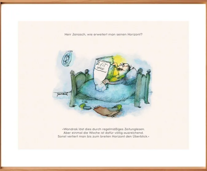 Exklusiver Bestandteil dieser Sonderedition ist die auf nur 999 Stück limitierte und handnummerierte Druckgrafik »Herr Janosch, wie erweitert man seinen Horizont?«. Die Zeichnung im Format 28 x 20 cm ist auf hochwertigem Naturpapier gedruckt und eignet sich ideal zum Verschenken oder zum Schmücken der eigenen vier Wände.