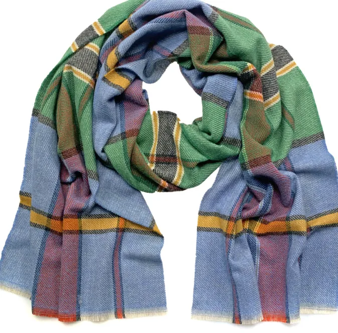 Erleben Sie kuschelige Wärme und zeitlosen Stil mit unserem extrabreiten Wollschal, der mit seinem markanten Karomuster und kurzen Fransen beeindruckt. Die kräftigen Farbflächen, die durch kontrastfarbene Streifen akzentuiert werden, machen diesen Schal zu einem echten Hingucker und ermöglichen vielseitige Kombinationsmöglichkeiten.