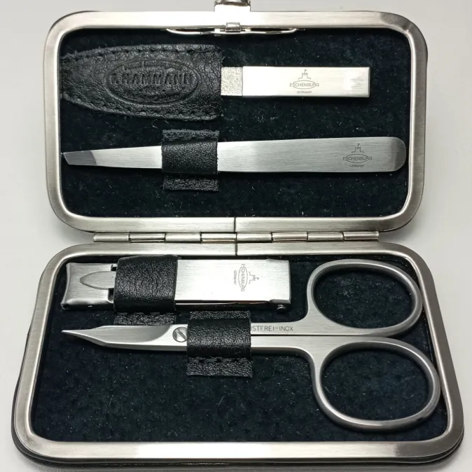 Die vier Instrumente von Eschenburg stehen in Qualität und Herstellung in Deutschland dem exquisiten Etui in nichts nach. Sie sind heißgeschmiedet und allseits von Hand geschliffen und poliert. Kombi-Schere: sehr feinausgearbeitete Schneiden ermöglichen sichere Schnitte an Nagel und -haut. Knipser: ein kleines Hightech Gerät, dass allein in der Konstruktion sehr aufwendig ist, um es in solch kompakten Format solide, scharf, fein und präzise gefertigt. Saphir-Nagelfeile: mit feiner und grober Seite, mit ihren polierten Kanten eignet sie sich hervorragend zum Ausfeilen der Nagelecken. Pinzette: fasst sehr präzise und schont so die Haut.