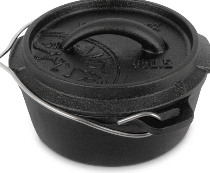 Durch die hervorragenden Eigenschaften des Gusseisens und die spezielle Oberflächenstruktur wird die Wärme effizient gespeichert und weitergeleitet. Die vorbehandelte Oberfläche (seasoned finish) macht ein erstmaliges Einbrennen unnötig und der robuste Feuertopf kann sofort verwendet werden. Im Freien wird er auf dem offenen Feuer oder mit Holzkohle verwendet. Der erhöhte Rand des Deckels ermöglicht es, Glut oder Holzkohle auch auf dem Feuertopf zu platzieren. So wird der Feuertopf von allen Seiten beheizt und eignet sich beispielsweise auch zum Brot backen. Der robuste Henkel ermöglicht das sichere Heben des Feuertopfes, drei Füße geben dem Feuertopf einen sicheren Stand und eine Thermometerdurchführung ermöglicht es, die Temperatur zu überprüfen, ohne den Deckel anheben zu müssen. Ein besonderes Extra – der Deckel lässt sich umgedreht auch als Pfanne verwenden.