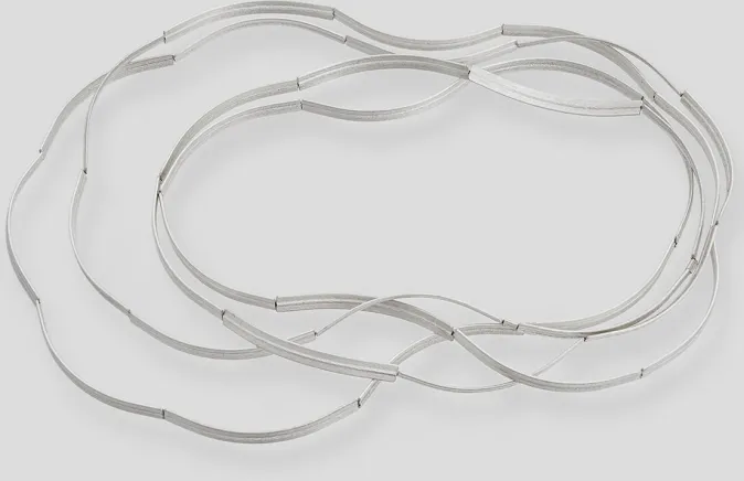 Die filigrane Kette »Bogen« von Designerin Franziska Rappold, aus der Kollektion »Geprägt«, ist aus hochwertigem Feinsilber in ihrem Atelier in Freiburg gefertigt worden. Die Schmückstücke von sind so gestaltet, dass sie variabel und unkompliziert tragbar sind. Die Gestaltungslinien der Schmuckkollektion orientieren sich an einfachen Grundformen, die sich durch eine Aneinanderreihung zu interessanten, schlichten und eleganten Schmuckstücken fügen.