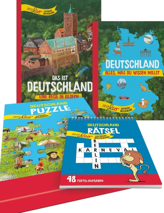 Die vier Bestandteile der Edition greifen perfekt ineinander: Das Wissensbuch »Deutschland – Alles, was du wissen willst« erklärt komplexe Themen spannend und anschaulich. Der großformatige Bildband »Das ist Deutschland – Eine Reise in Bildern« zeigt verschiedenste Facetten unseres Landes in wunderschönen Panorama-Illustrationen: von der Nordsee zu den Alpen, von mittelalterlichen Städtchen bis hin zu modernen Metropolen. Das große Deutschland-Puzzle vermittelt erste geografische Kenntnisse und lädt die ganze Familie zum Mitmachen ein. Und mit den kniffligen Fragen des Rätselblocks erfahren Ihre Kinder beim lustigen Knobeln ganz nebenbei viel Interessantes über unser Land.