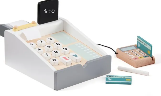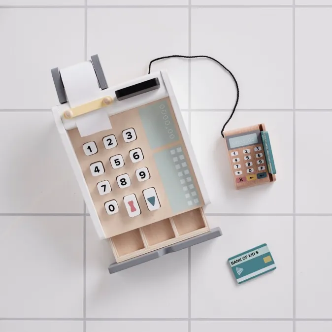 Diese Kasse im modernen Design gehört in jeden Kaufladen. Sie lässt sich öffnen, um Münzen und Scheine zu verstauen – selbstverständlich können die kleinen Kunden aber auch mit der Karte bezahlen. Karte durch das Gerät gezogen, Code eingegeben, schon ist die Ware bezahlt. Außerdem bietet die kleine Tafel an der Kasse die Möglichkeit, mit Kreide selber Zwischensummen zu notieren. Durch die mitgelieferte Bonrolle erhält der Kunde am Schluss sogar eine handgeschriebene Quittung für seinen Einkauf.
