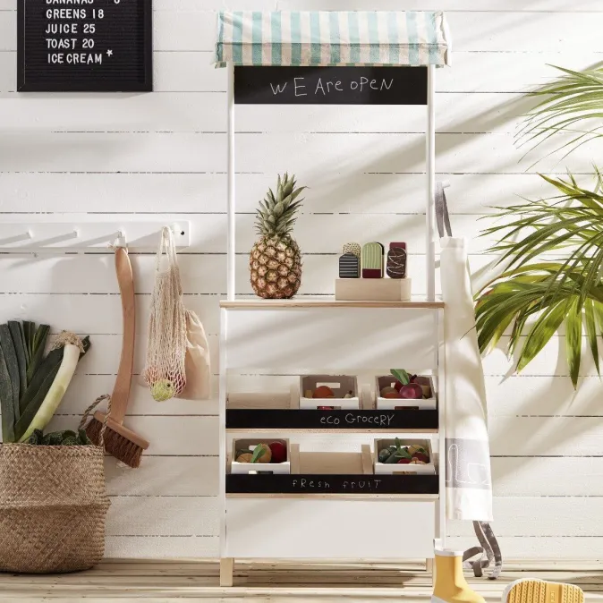 Auch in Zeiten der Supermärkte hat das Spiel mit einem klassischen Kaufmannsladen nicht an Beliebtheit verloren. Mit dem hübschen Marktstand der skandinavischen Marke Kids Concept können Ihre Kleinen sich als Verkäufer und Verkäuferinnen ausprobieren. In zwei Regale mit sechs Fächern und an den zwei Haken zum Aufhängen können die Kleinen zum Beispiel Obst und Gemüse anbieten – der Preis findet auf Tafel zum Beschriften Platz. „Darf es ein noch etwas sein?“ Da können Mama und Papa doch bestimmt nicht Nein sagen!