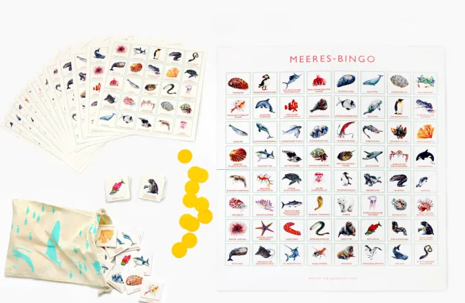 Umweltbewusstsein bereits zu Hause schaffen! Spielen Sie Bingo mit gigantischen Walen, faszinierenden Haien, tropischen Fischen und glibberigen Quallen. Dieses familienfreundliche Spiel steckt voller Meeresbewohner für jede Menge Bingo-Spaß. Neben bekannten Meerestieren gibt es auch seltene, ungewöhnliche Wesen zu entdecken – zum Beispiel die gelbe Plättchenseeschlange oder den biolumineszenten Kraken. Das Meeres-Bingo bietet 64 seltsame, wundervolle und wunderschöne Tierarten und steckt voller erstaunlicher Fakten und prächtiger Illustrationen, die Meeresliebhaber*innen begeistern werden.