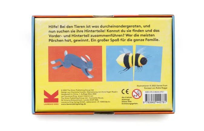 Hilfe! Bei den Tieren ist was durcheinandergeraten, und nun suchen sie ihre Popos! Wer kann sie finden und ihre Vorder- und Hinterteile zusammenführen? Aber aufgepasst! Ein Okapi sieht vorne anders aus als hinten… Wer die meisten Pärchen findet, gewinnt. Ein großer Spaß für die ganze Familie!