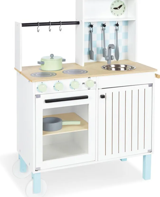 - Lieferumfang: 2 Türen; Waschschüssel; drehbare Knöpfe (mit Klickgeräusch); Kochbesteck (3-teilig); 2 Töpfe; 2 Rollen