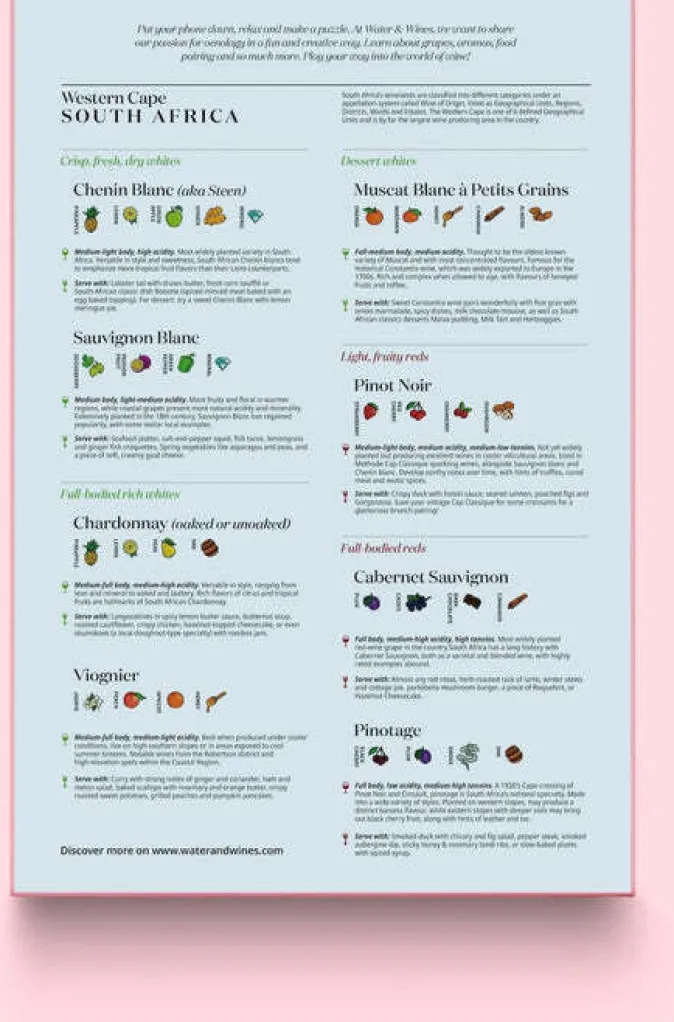 Sorgfältig ausgewählt von Die Puzzlebox mit Traubenprofilen und vielen Tipps zur Kombination mit Speisen ermöglicht es Ihnen, die Aromen und Eigenschaften der lokalen Rebsorten zu erkunden. Lernen Sie beim Zusammensetzen des Puzzles mehr über die einzelnen Regionen und Bezirke und gewinnen Sie ein tieferes Verständnis für die reiche Weinkultur Südafrikas.