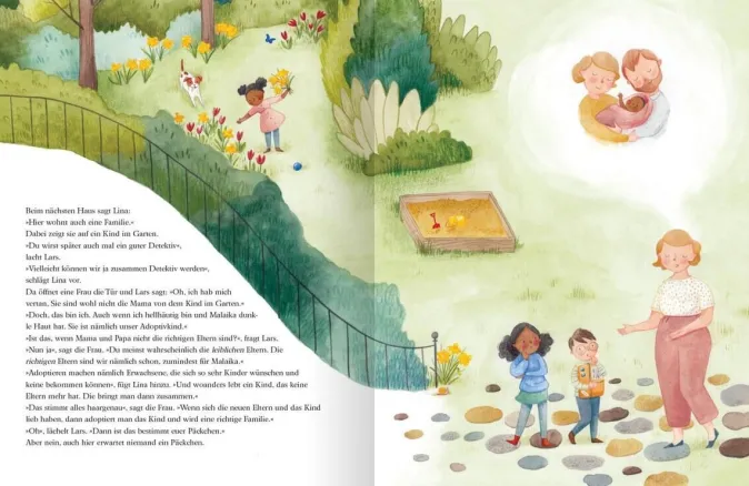 Als Lars mit seiner Mama vom Einkaufen zurückkommt, entdeckt er ein Päckchen auf dem Bürgersteig vor ihrem Haus. „An Familie“ steht darauf – den Rest kann man nicht mehr lesen, denn der Regen hat die Schrift verschmiert. Gemeinsam mit Lina, die nebenan wohnt, macht sich Lars auf eine Entdeckungsreise durch die Nachbarschaft und lernt dabei die unterschiedlichsten Familien kennen. Wem das Päckchen wohl gehört?