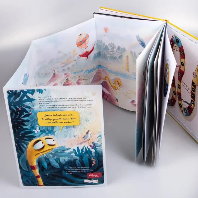 Als sich der NAhUND zum Erzieher aufspielt, wird es dem NEINhorn zu blöd und es zischt ab. Nach einer langen Wanderung landet es im dichten dunklen Dschungel, wo die SchLANGEWEILE von einem Assst runterhängt und allesss sssuper schlangweilig findet! Egal, was das NEINhorn vorschlägt, sie hat keine Schlussst darauf.