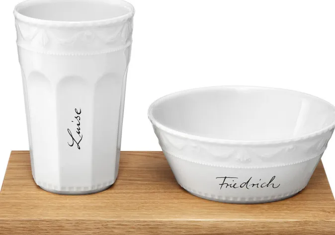 Das KURLAND Muesli-Gourmet Set steht für die harmonische Verbindung von Genuss, Gesundheit, Regionalität, Handwerkskunst und Design. Die konische Müslischale (0,45 Liter) nimmt die klassische KURLAND Form auf, die seit über 225 Jahren die Menschen begeistert. Der dazu passende, elegante KURLAND Latte Macchiato Becher (0,4 Liter) ist von der schlanken Form der facettierten Gläser inspiriert, wie sie traditionell für die Zubereitung von Latte Macchiato oder Cold Brew Coffee verwendet werden. Das formschöne Brett aus massivem Eichenholz bildet einen reizvollen Materialkontrast zu dem Weiß des sorgfältig von Hand gefertigten KPM Porzellans. Schale und Becher sind auf Wunsch personalisierbar.