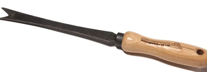 Langer, geschmiedeter Unkrautstecher mit einer v-förmigen Klingenspitze um Unkraut mit tief sitzenden, festen Wurzeln gezielt ausstechen zu können. Die Werkzeugspitze schärft sich beim Stechen in den Boden von selbst nach, Bio Cultivator mit einem Zinken zum Jäten und Bodenlüften in kleineren Beeten.