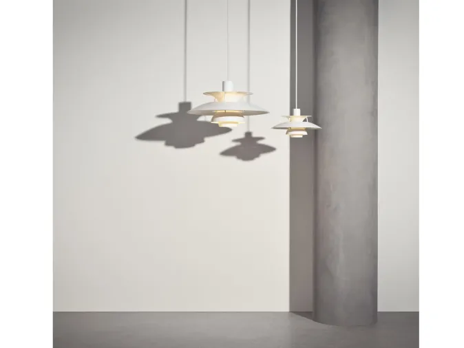Die »PH 5 Mini« von Louis Poulsen ist die kleinere Variante der weltberühmten Pendelleuchte des Pioniers des Lichtdesigns: 1958 entwarf Poul Henningsen die »PH 5«. Sie ist eine Hommage an den 1958 designten Leuchtenklassiker und noch Heute das meistverkaufte Werk des dänischen Unternehmens Louis Poulsen. Die monochrome Farbgebung lenkt den Blick auf den Formverlauf und verleiht der Leuchte einen grafischen, zeitgenössischen Look. Die Leuchte strahlt vollkommen blendfreies Licht ab. In ihrem Aufbau folgt sie dem Prinzip eines reflektierenden Dreischirmsystems, das den Großteil des Lichts nachunten abstrahlt. Die Leuchte strahlt das Licht sowohl nach unten als auch zur Seite ab und erhellt sich dadurch selbst.