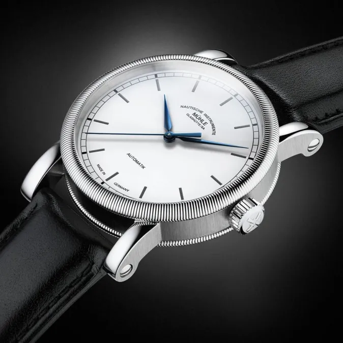 Für ein perfektes Äußeres sorgt auch das hochwertige Edelstahl-Gehäuse. Unterhalb der kannelierten Lünette offenbart es die typischen Merkmale der Teutonia-Familie. So wird der Gehäuse-Mittelteil mit dem charakteristischen senkrechten Schliff versehen, der von Hand aufgebracht wird. Die Oberseiten der volutenförmigen Hörner werden dagegen fein poliert und erzeugen eine abwechslungsreiche Spannung zwischen mattierten und polierten Oberflächen und der kannelierten Lünette. Wie bei Mühle-Glashütte üblich wird das hochwertige, bis 10 bar wasserdichte Gehäuse und einem kratzfesten, entspiegelten Saphirglas versehen, das jederzeit den ungetrübten Blick auf das edle Zifferblatt ermöglicht. Das Uhrwerk kann wiederum durch den Sichtboden aus Saphirglas bewundert werden. Das Automatikwerk wird mit der 2003 von Mühle entwickelten, patentierten Spechthals-Regulierung ausgestattet. Diese sorgt dafür, dass sich die Reglage des in sechs Lagen regulierten Uhrwerks auch dann nicht verändert, wenn die Uhr einmal einen stärkeren Stoß verkraften muss.