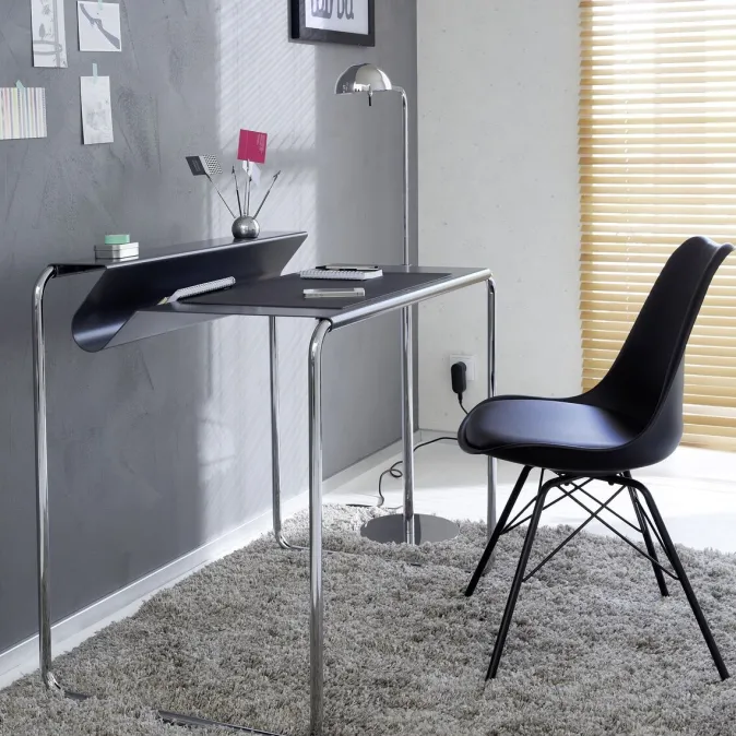 - Material: Arbeitsfläche seidenmatt lackiert in schwarz, Fußgestell aus Chrom