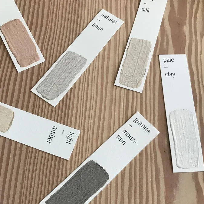- Inhalt: 6 Farbkarten für die Farben: Natural-Linien, Pale-Clay, Raw-Silk, Granite-Mountain, Light-Amber, Rose-Pepper