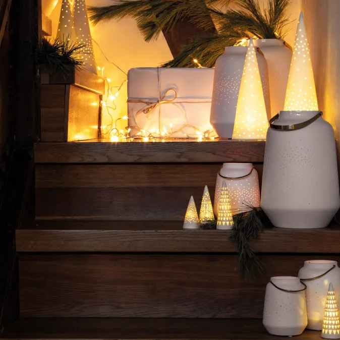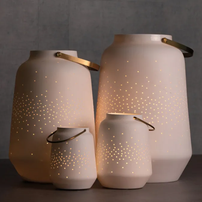 Diese handgefertigte Porzellanlaterne von Räder ist ein echter Blickfang für jede Jahreszeit. Die zarte Teelicht-Laterne aus Porzellan, kombiniert mit einem eleganten Metallgriff in Weiß-Kupfer, schafft ein warmes und einladendes Licht. Die feinen, eingearbeiteten Löcher lassen das Licht durchscheinen und zaubern eine stimmungsvolle Atmosphäre, die an einen funkelnden Sternenhimmel erinnert. Ob als Geschenk oder für das eigene Zuhause – diese Laterne ist eine wunderschöne Dekoration, die Liebe, Glück und Geborgenheit symbolisiert.