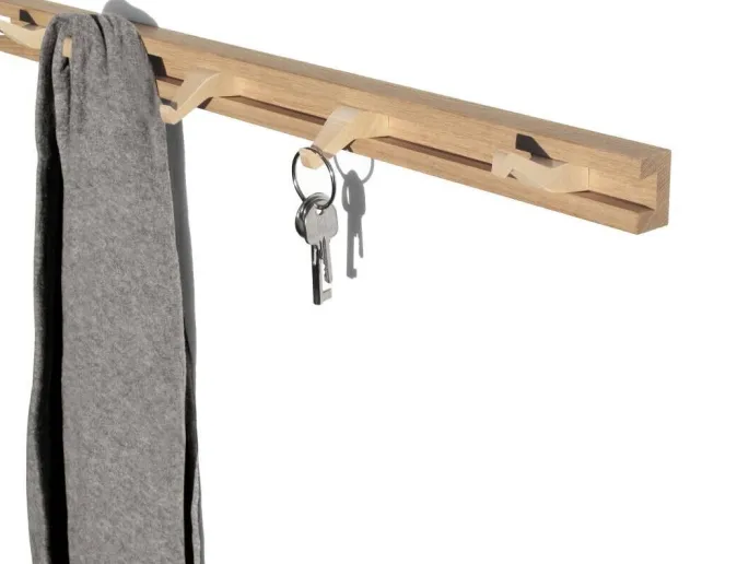 Die schlichte Garderobenleiste »Anderl« aus massivem Eichen- und Ahornholz sorgt mit ihren 60 cm und 5 Haken für Ordnung in der Garderobe, im Bad oder Flur. Die Haken der Garderobenleiste bestehen aus Ahornholz und erinnern an die hangeschnitzten Garderoben früherer Zeiten. Sie können wahlweise nach oben- oder untenzeigend in die Leiste aus Eichenholz eingeschoben werden. Das gibt der Funktionalität einen spielerischen Charakter und Individualität. Die Hakenleiste ist ideal für schmale Flure, aber auch im Bad oder Eingangsbereich macht »Anderl« eine gute Figur. Wahlweise gibt es die Garderobenliste auch mit 7 Haken und einer Länge von insgesamt 85 cm.