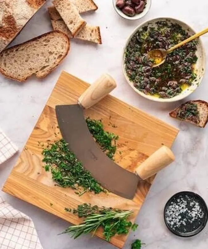 Das Wiegemesser »Soul« von triangle beeindruckt nicht nur durch sein elegantes Design mit fein gearbeiteten Griffen aus deutscher Kernesche, sondern auch durch seine außerordentlich hochwertige, gehärtete Klinge. Wiegemesser werden traditionell verwendet, um Kräuter, Nüsse, Knoblauchzehen und ähnliches schnell und einfach zu zerkleinern. Mit einer Länge von 23 cm sind größere Modelle jedoch auch ideal zum Schneiden von Pizza, Flammkuchen und Blechkuchen geeignet und machen auch auf dem Tisch eine gute Figur.