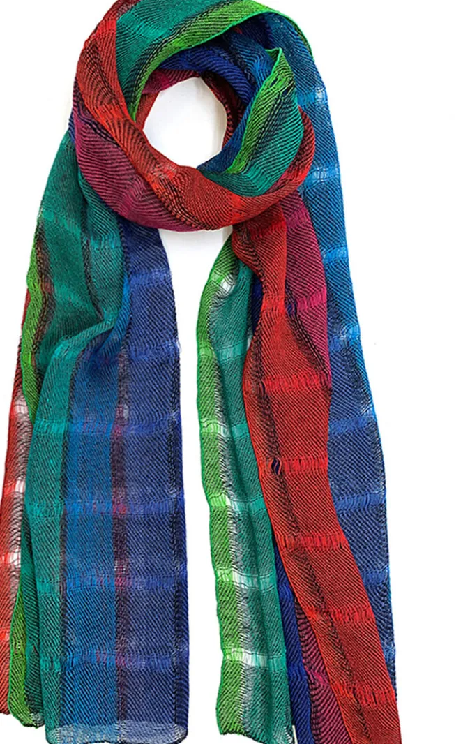 Der farbenfrohe Schal wird aus feinem Leinengarn in Hamburg handgewebt. Er hat eine großzügige Breite und mit seinem feinen und luftigen Gewebe einen angenehmen Fall. Transparente Streifen durchziehen den durchscheinenden Stoff und erzeugen einen interessanten Effekt. In seiner Leichtigkeit ist der Schal eine lässige Ergänzung zu Jacken, Mänteln, Pullovern oder Blusen. Der Leinenschal ist ein modischer Alltagsbegleiter, der lässig übergeworfen, als Stola getragen oder chic zum Ausgehen kombiniert werden kann.