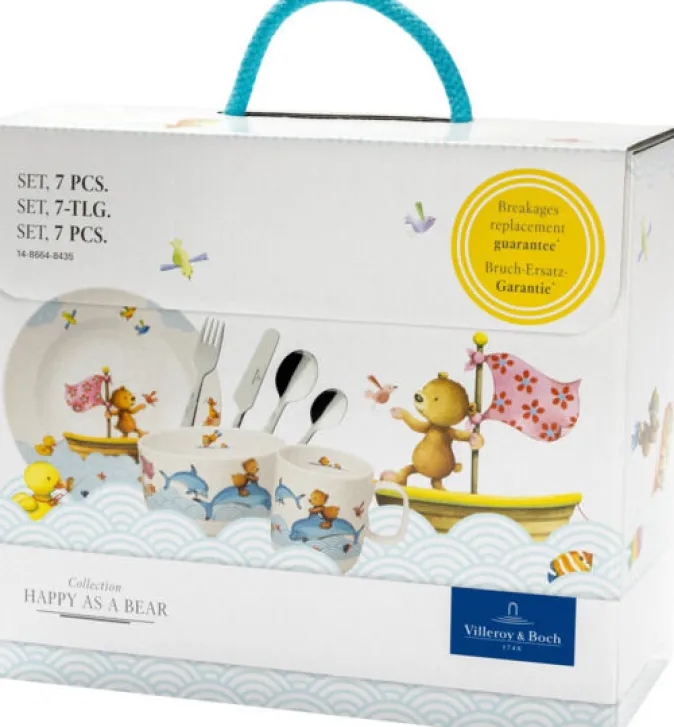 Die Kollektion Hungry as a Bear steht für besonders robustes und farbenfrohes Kindergeschirr. Bereits seit 1748 stellt Villeroy & Boch hochwertiges Porzellan höchster Qualität her. Das 7-teilige Kinder-Set besteht aus einem flachen Teller, einer Müslischale, einem praktischen Becher mit Henkel sowie dem passenden Besteck. Geht in den ersten 2 Jahren nach dem Kauf etwas zu Bruch, wird es kostenlos ersetzt.