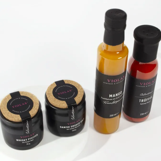 Entdecken Sie unsere exklusive Genuss-Selection, die Ihre Geschmackssinne auf eine außergewöhnliche Reise mitnimmt. Dieses Set enthält vier erlesene Delikatessen: Trüffel Ketchup Deluxe, Whisky Pfeffer, Hickory Smoked Salt, Fruchtgenuss Mango.
