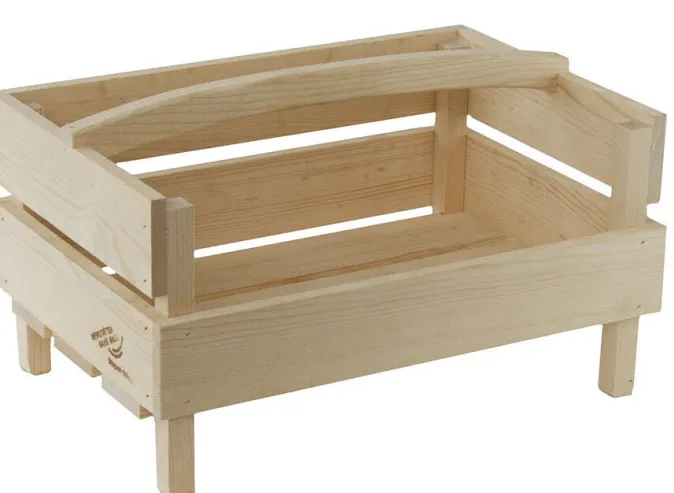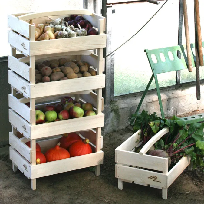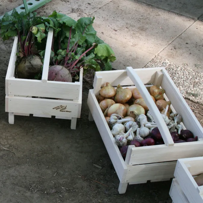 Die stabile Kiste eignet sich perfekt zur Lagerung von Obst und Gemüse und ist zu mehreren gestapelt ein praktisches Vorratsregal. Dank der offenen Vorderseite der Stiege liegt die Ernte jederzeit griffbereit. Aus regionalem Holz gefertigt in Werkstätten für Menschen mit Behinderungen.