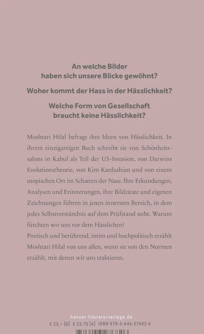Vom Sehen und Gesehenwerden, von Selbstbildern und Selbstzweifeln – Moshtari Hilal schreibt über HässlichkeitDichte Körperbehaarung, braune Zähne, große Nasen: Moshtari Hilal befragt Ideen von Hässlichkeit. In ihrem einzigartigen Buch schreibt sie von Beauty Salons in Kabul als Teil der US-Invasion, von Darwins Evolutionstheorie, von Kim Kardashian und von einem utopischen Ort im Schatten der Nase. Ihre Erkundungen, Analysen und Erinnerungen, ihre Bildzitate und eigenen Zeichnungen führen in jenen innersten Bereich, in dem jedes Selbstverständnis auf dem Prüfstand steht. Warum fürchten wir uns vor dem Hässlichen? Poetisch und berührend, intim und hochpolitisch erzählt Moshtari Hilal von uns allen, wenn sie von den Normen erzählt, mit denen wir uns traktieren.