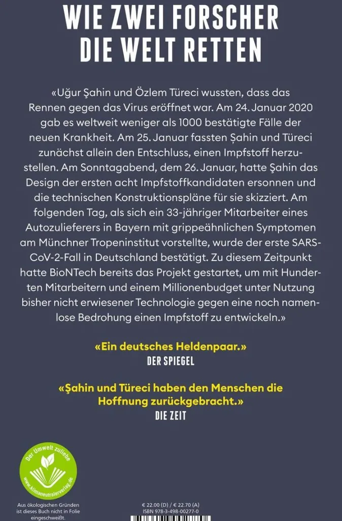 Das Buch zeigt, wie die beiden Wissenschaftler auf 30 Jahre Forschung an der neuartigen mRNA-Technologie aufbauen konnten, um einen Ausweg aus der Corona-Pandemie zu finden. Und es teilt die Vision der Mediziner, mit der mRNA-Technologie Therapien gegen viele andere Krankheiten wie Krebs, HIV oder Tuberkulose zu finden. Eine beeindruckende Geschichte zweier außergewöhnlicher Menschen.