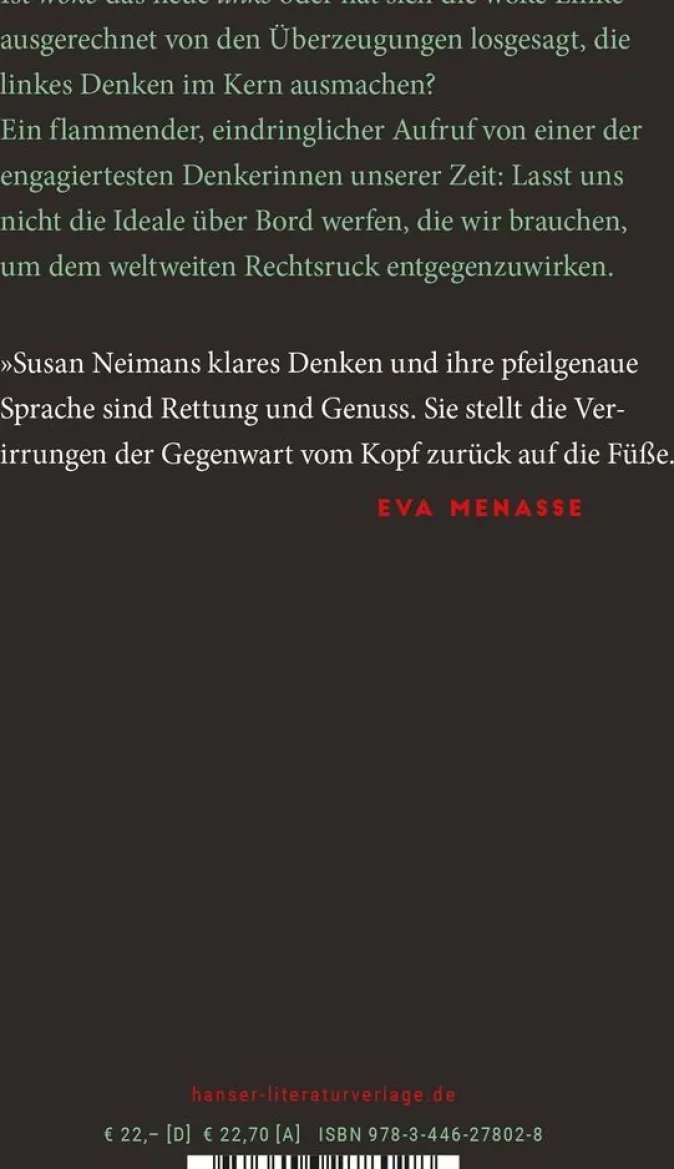 Die streitlustige Kritik einer überzeugten Linken an Identitätspolitik. „Susan Neimans klares Denken und ihre pfeilgenaue Sprache sind Rettung und Genuss.“ (Eva Menasse) Seit sie denken kann, ist Susan Neiman erklärte Linke. Doch seit wann ist die Linke woke? In ihrer von Leidenschaft und Witz befeuerten Streitschrift untersucht sie, wie zeitgenössische Stimmen, die sich als links bezeichnen, ausgerechnet die Überzeugungen aufgegeben haben, die für den linken Standpunkt entscheidend sind: ein Bekenntnis zum Universalismus, der Glaube an die Möglichkeit des Fortschritts und die klare Unterscheidung zwischen Macht und Gerechtigkeit. Als Philosophin überprüft sie dabei die identitätspolitische Kritik an der Aufklärung als rassistisch, kolonialistisch, eurozentristisch und stellt fest: Die heutige Linke beraubt sich selbst der Konzepte, die für den Widerstand gegen den weltweiten Rechtsruck dringend gebraucht werden.