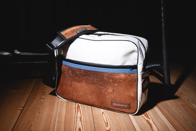 Exklusiv designt für die ZEIT: Die neue Tasche »Hocke XL« aus der Manufaktur Zirkeltraining. Der große Retro-Begleiter wird handgefertigt aus gebrauchtem Sportgeräte-Leder und neuer weißer LKW-Plane, akzentuiert mit einem Streifen aus Turnmattenmaterial. Außergewöhnliches Design sowie sinnvolle Ergänzungen zeichnen Ihre neue Tasche aus. Hochwertig gefüttertes großes Innenfach, passend für einen DIN A4 Ordner, kleines Innenfach mit Zip, Handy- und Stiftehalter, zusätzliches Aussenfach mit Zip. Ein 80mm breiter Schultertragegurt sorgt zudem für einen angenehmen Tragekomfort.