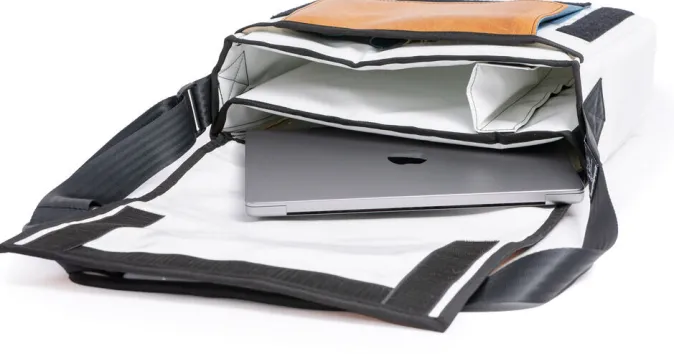 - Material: Gebrauchtes Sportgeräte-Leder (Taschendeckel), weiße LKW-Plane (im Taschenkörper)