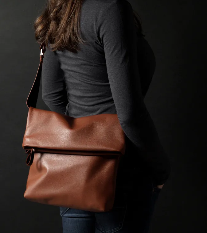 Exklusiv für die ZEIT ist die besondere Überschlagtasche »London« aus der Manufaktur Ackermann in der Farbe Cognac erhältlich.