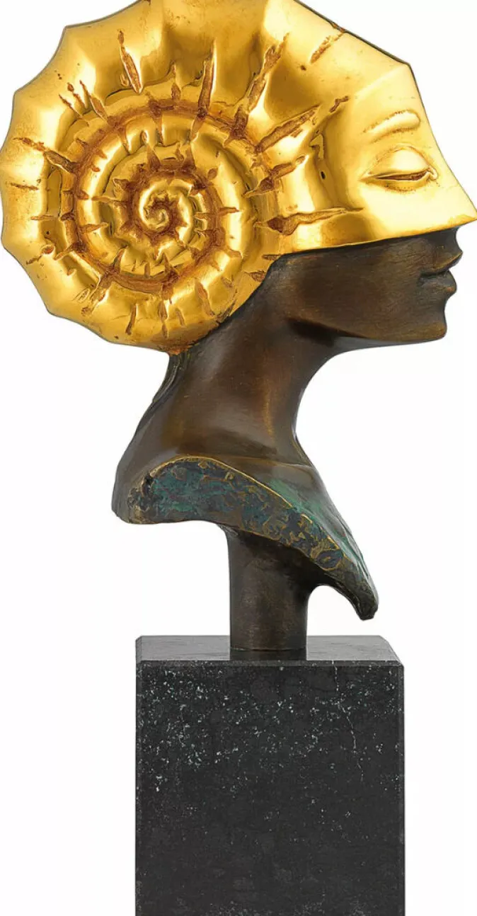 Tauchen Sie ein in die faszinierende Welt von Beckers Skulptur, die die Schönheit eines mathematisch präzisen, urzeitlichen Ammonits mit den gleichmäßigen Zügen eines Frauengesichts auf einzigartige Weise vereint. Diese surreal wirkende Büste strahlt eine zeitlose Eleganz aus und könnte ebenso gut aus einer jahrtausendealten Mythologie stammen. Die Edition dieser faszinierenden Skulptur besteht aus feinster Bronze mit kunstvoller Teilvergoldung. Durch das aufwändige Gießverfahren im Wachsausschmelzverfahren und die sorgfältige Patinierung entsteht ein Meisterwerk von unvergleichlicher Qualität. Jedes Exemplar dieser außergewöhnlichen Skulptur ist streng limitiert auf nur 99 Stück und trägt die handsignierte und nummerierte Kennzeichnung. Das Format der Skulptur beträgt inklusive des Diabassockels etwa 27 x 8,5 x 13,5 cm (H/B/T). Mit einem Gewicht von ca. 2,7 kg erhält die Skulptur eine angenehme Größe und ein solides Gewicht, das ihre Präsenz unterstreicht.