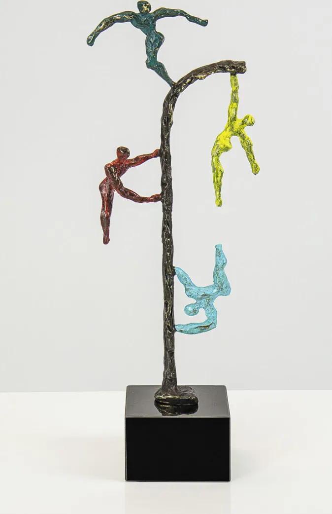 Buntes Treiben: Metallguss mit bronzierter Oberfläche, zum Teil bemalt, auf schwarzem Marmorsockel.