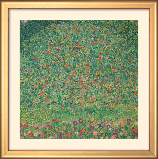 In Set sind die vier Bilder »Kirche in Cassone am Gardasee«, »Malcesine am Gardasee«, »Apfelbaum I« und »Die Sonnenblume«. Die vier Bilder von Gustav Klimt wurden aufwendig auf büttenähnlichem, schweren 250g Gmund Tactile reproduziert und sind in goldfarbener Massivholzrahmung gefasst. Ebenfalls sind alle Werke auch einzeln erhältlich.