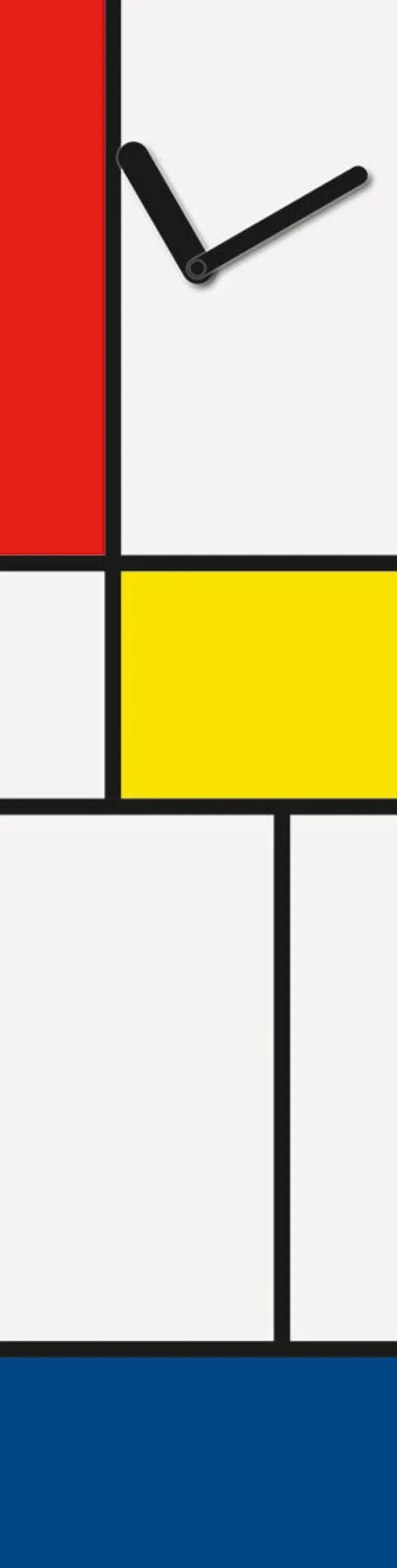 Eine Komposition in Rot, Blau, Gelb und Schwarz – ein Kunstwerk von Mondrian neu interpretiert in Form einer Wanduhr.