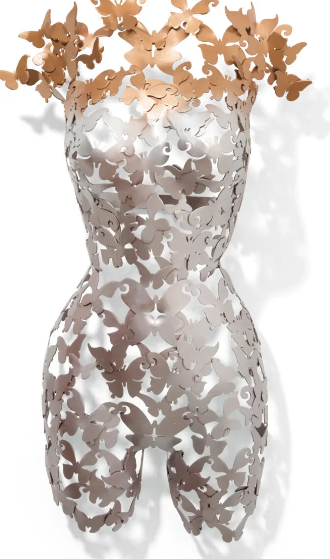 Eleganz in Metall: In Oliver Frannecks Skulptur »Papillon« verschmelzen viele kleine Schmetterlinge zu einem anmutigen Frauentorso. Für seine Werke zeichnet der Münchner Bildhauer zunächst die Konturen frei Hand, schneidet sie mit einem Laser aus Metall heraus und fügt die Einzelteile zur Skulptur zusammen. So entsteht ein spannender Dialog zwischen den Formen der Schmetterlinge und dem weiblichen Akt. Die Transparenz des Objekts erlaubt ein faszinierendes Spiel von Licht und Schatten. Mit der fragmentierten Darstellung des Körpers möchte Franneck Raum für die individuellen Fantasien der Betrachtenden schaffen.