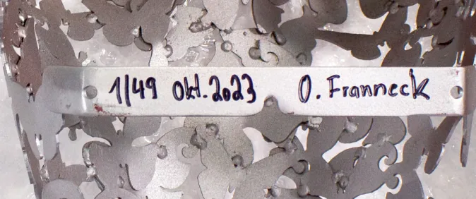Im künstlerischen Prozess zeichnet Franneck zunächst die Silhouetten der Fragmente per Hand. Anschließend schneidet er mithilfe dieser Schablonen die Konturen mit einem Laser aus Metall heraus. Zum Schluss fügt er die Einzelteile in der Form des weiblichen Aktes zusammen. Franneck arbeitet in diesem letzten Schritt absolut intuitiv und lässt damit jede Skulptur zu einem Unikat mit einer einzigartigen Struktur werden.