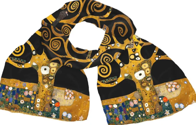Hochwertiger Seidenschal nach der Werksvorlage zum Stoclet-Fries (1909-11) in der Farbvariante „schwarz“. Wie in einem Paradiesgarten entfaltet sich spiralförmig der Baum des Lebens und der Erkenntnis. Schal aus 100% feinster Satin-Seide – ausdrucksstark und leuchtend. Format 175 x 33 cm (L/B). Handrouliert.
