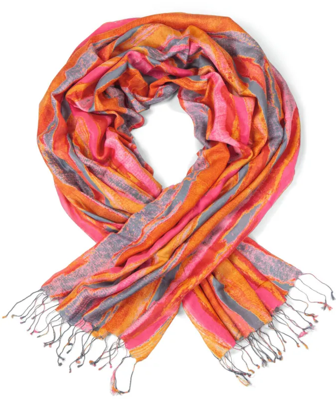 Ein Farbtupfer aus lebendigen Rot- und Orangetönen in Kombination mit modernem Grau ist dieser Schal aus 100%iger Seide. Mit Fransenabschluss.